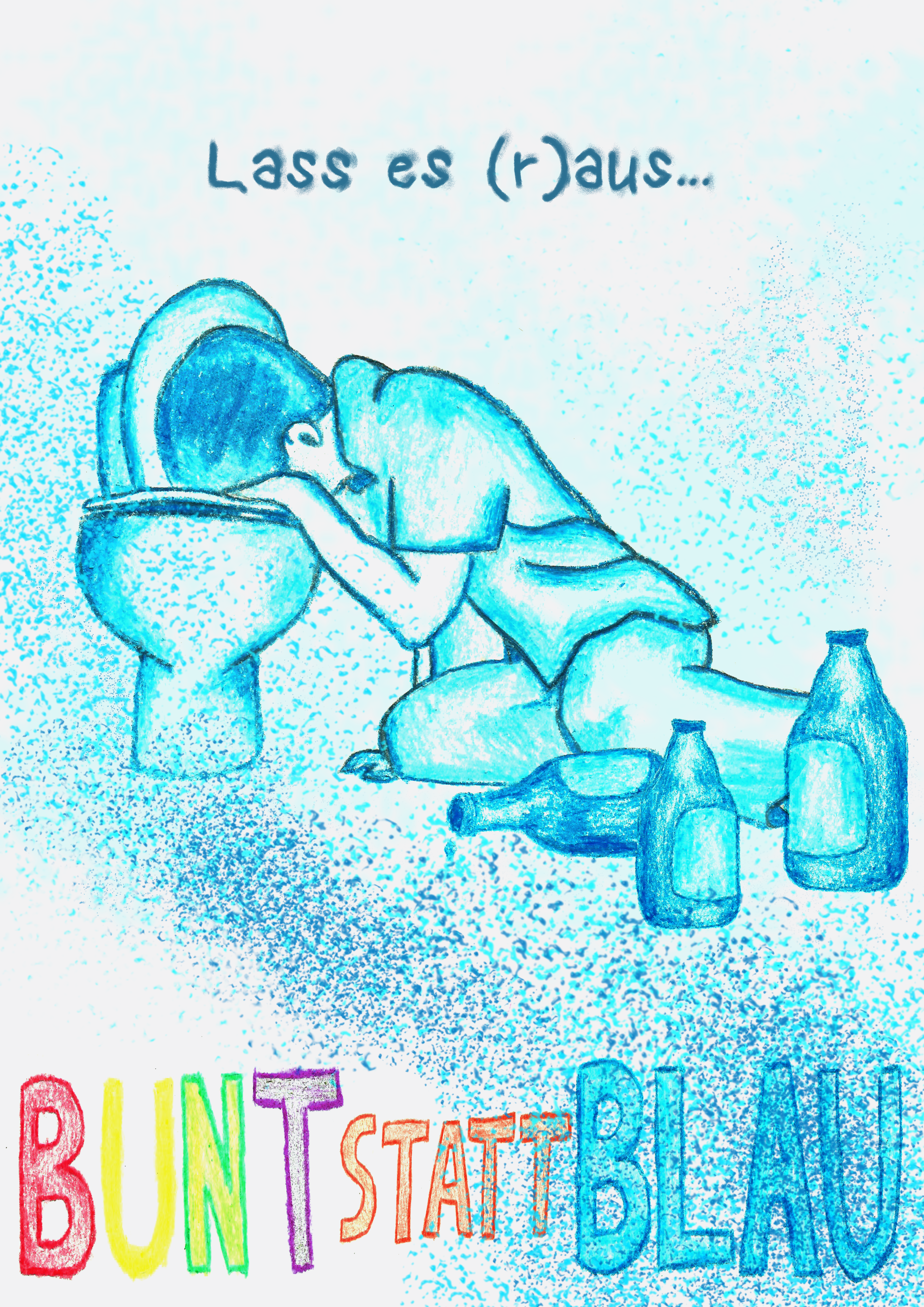 Ich bin jetzt einer von 3 Landessiegern im Saarland. Natürlich habe ich in meinem Umfeld auch Erfahrungen mit Alkohol gemacht und wollte durch meine Teilnahme an dem Wettbewerb auf das Problem mit Alkohol vor allem unter Jugendlichen hinweisen. Mein Plakat zeigt deswegen eine leider nicht untypische Situation, wie jemand über einer Toilettenschüssel hängt und sich aufgrund einer Alkoholvergiftung übergibt. Mit den Worten "Lass es (r)aus" will ich den Satz zeigen, den viele Betroffene in der Situation zu hören kriegen mit der versteckten Botschaft, dass man den Alkohol beim nächsten Mal auch auslassen kann und man ohne Alkohol den Abend besser genießen kann.